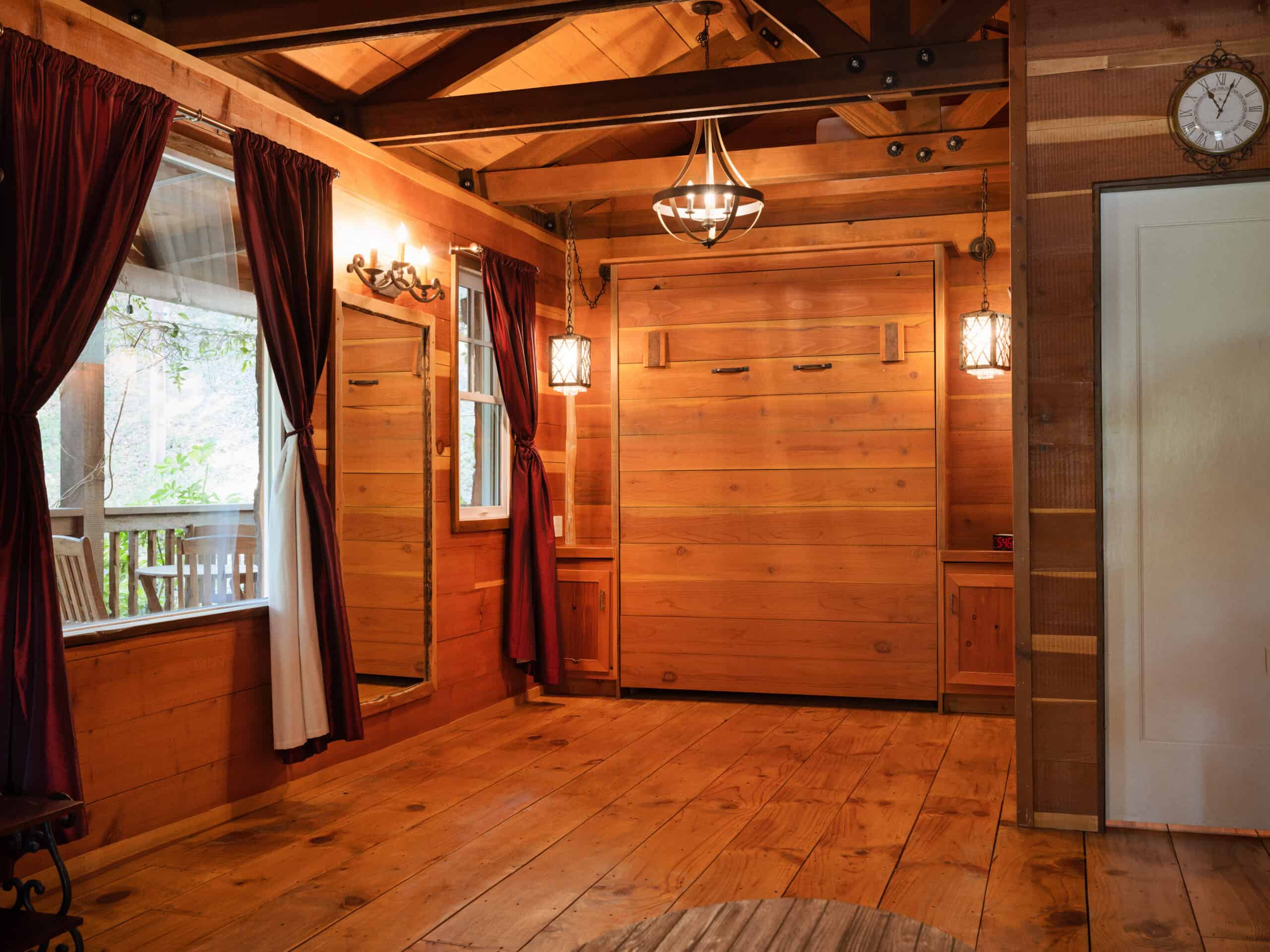 This 455 square foot studio-style suite sleeps up to 4 guests and features 1 Queen Murphy bed and 1 pullout sofa. There is a kitchenette with a full-size refrigerator, double-doors leading to a wrap-around porch and private patio space, propane fire pit and a simple bathroom with a large walk-in shower. This quaint cottage is tucked among several oak trees and has a tin roof, so if you’re lucky enough to get some light rain during your stay, you are in for a treat!